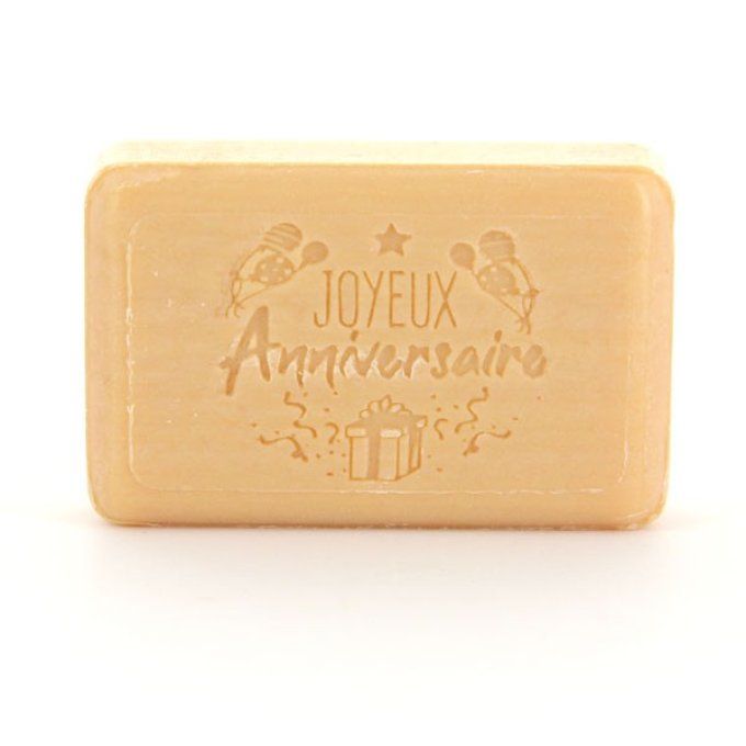 Savon artisanal joyeux anniversaire parfum sucré avec des notes légèrement fleurie, des paillettes minérales donc naturelles, feront briller le savon lorsqu'il sera mouillé.